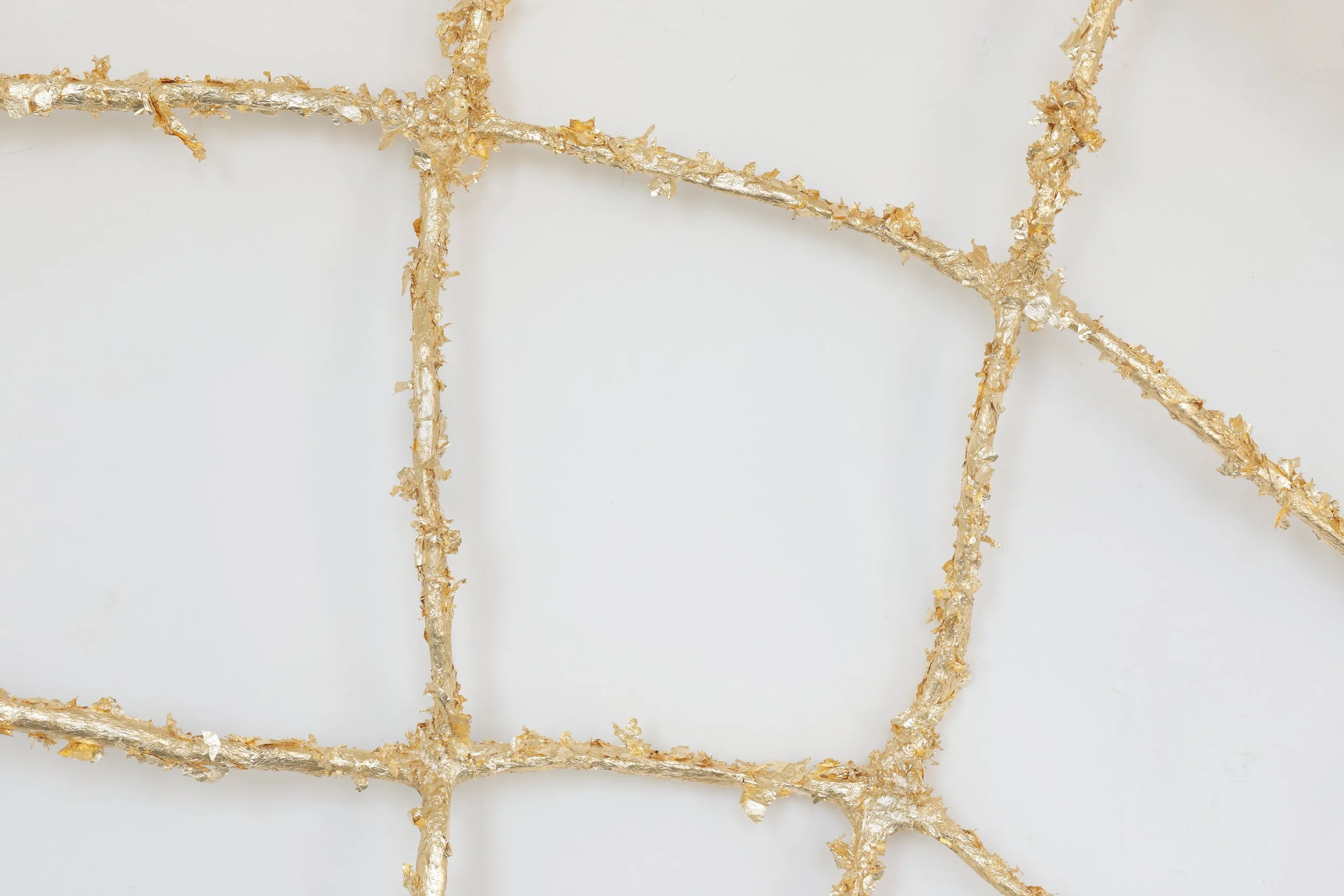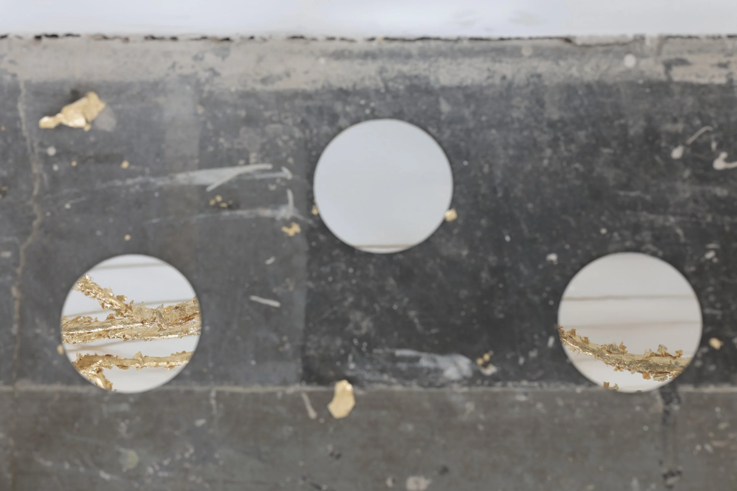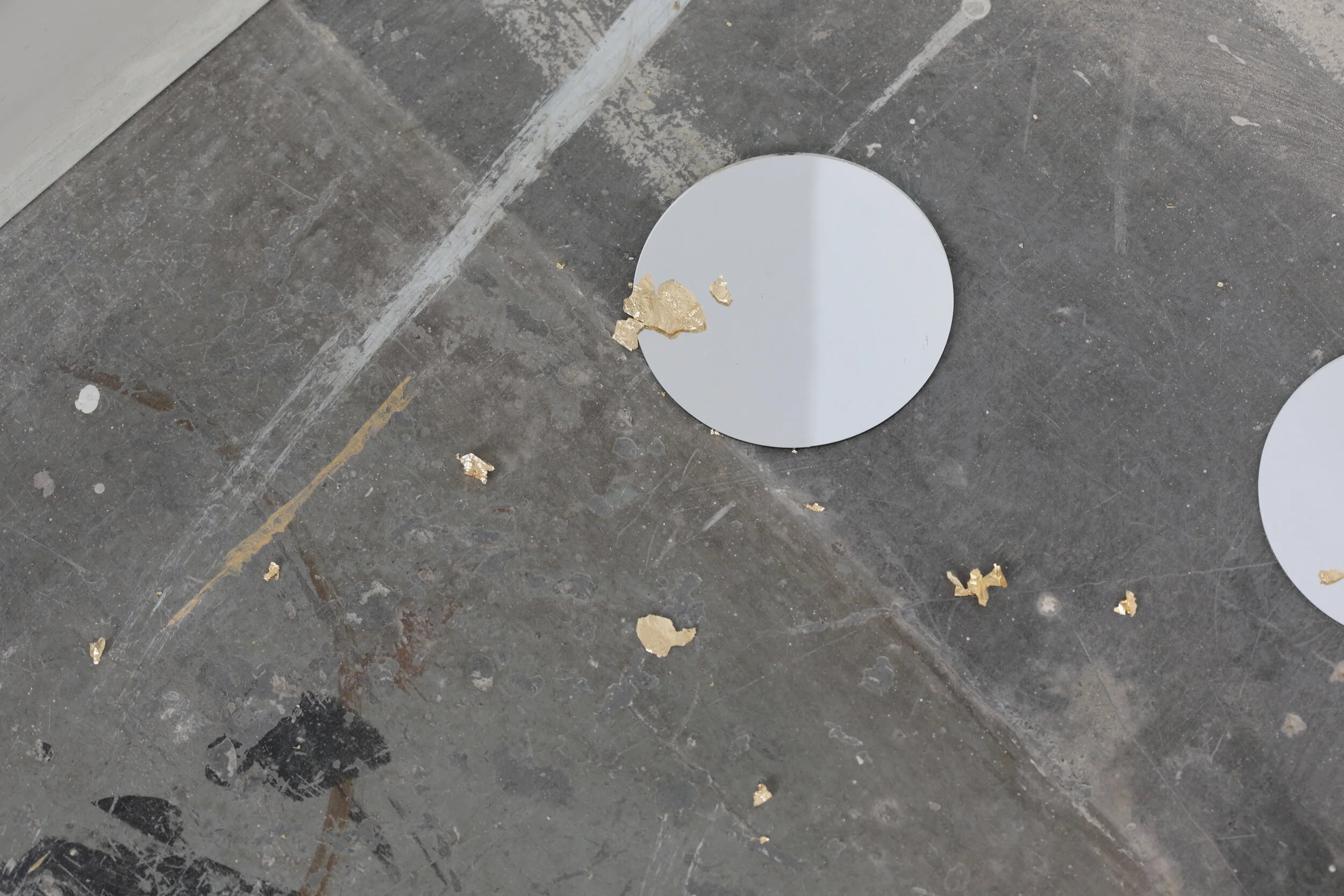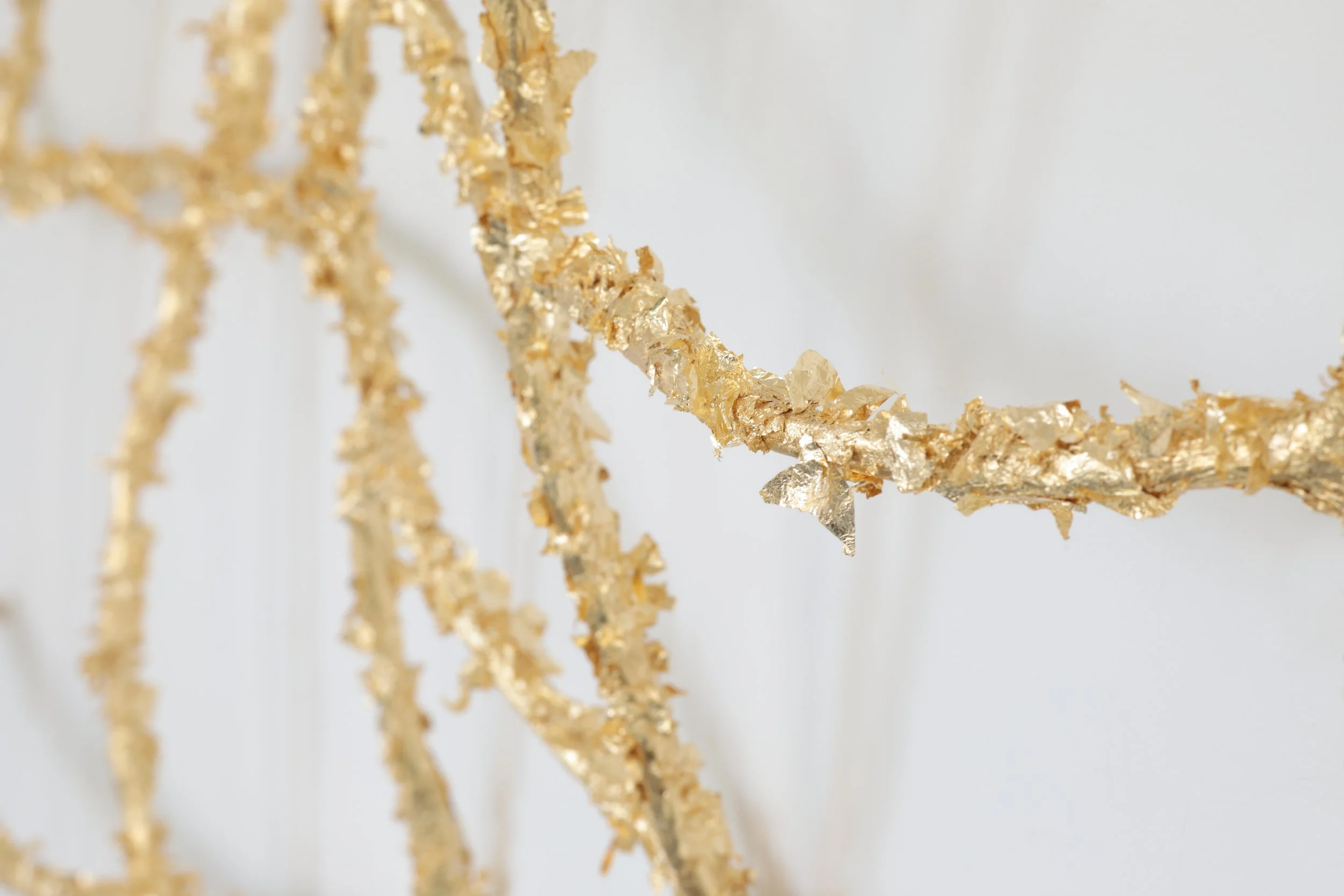 14k gold leaf adds symbolism of devotion and respect to this ubiquitous composition. Small particles of gold leaf sway in the breeze as viewers pass by, further demonstrating the vitality that audience participation brings to this work. Through the duration of the exhibition, these particles of gold leaf start to fall off and collect on the floor, acting like dust floating through the space.
